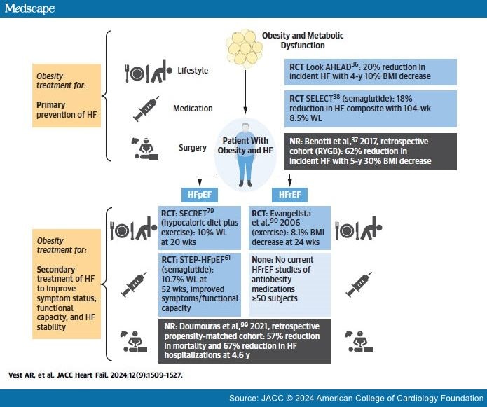 Central Illustration. Treatment of Obesity Across the Lifestyle, Surgery, and Medication Domains for Primary Prevention and Secondary Treatment of HF