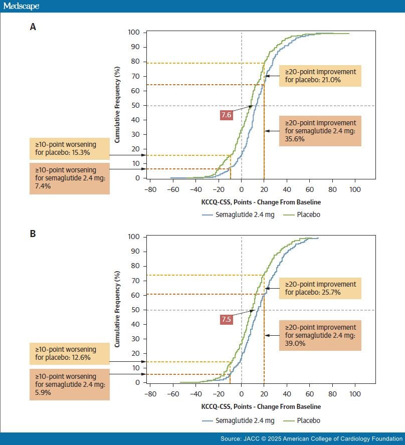 Where 2 CDF curves are parallel, that is, when the underlying distributions are of similar shape, as in the pooled STEP-HFpEF analysis, there is likely no true responder group—a subgroup of patients with a differential treatment effect relative to the overall treated population. Here, the treatment effect is best characterized by the mean difference and 95% CI between the treatment groups. This was the primary efficacy endpoint for the STEP-HFpEF trials, approximated by the horizontal separation of the CDF curves (Figure 1). STEP-HFpEF[4] investigators found a mean 7.8 (95% CI: 4.8-10.9) point improvement in KCCQ-CSS at 52 weeks for semaglutide vs placebo; similar to STEP-HFpEF-DM (Research Study to Look at How Well Semaglutide Works in People Living With Heart Failure, Obesity and Type 2 Diabetes).[5]